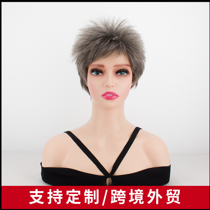 クロスボーダー欧米風ウィッグ、ミックスグレーウィッグ、ショートヘア、バング付き、頭皮なしウィッグ、女性用フルウィッグ、耐熱ファイバーウィッグ