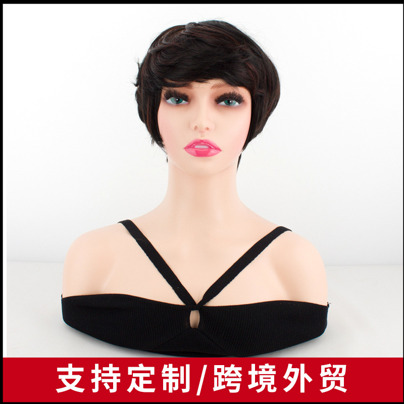 欧米のかつらの微巻きの斜め前髪のふわふわしたショートヘアの自然な色は茶色の木目のショートヘアを選んで、化学繊維のかつらを整えます。