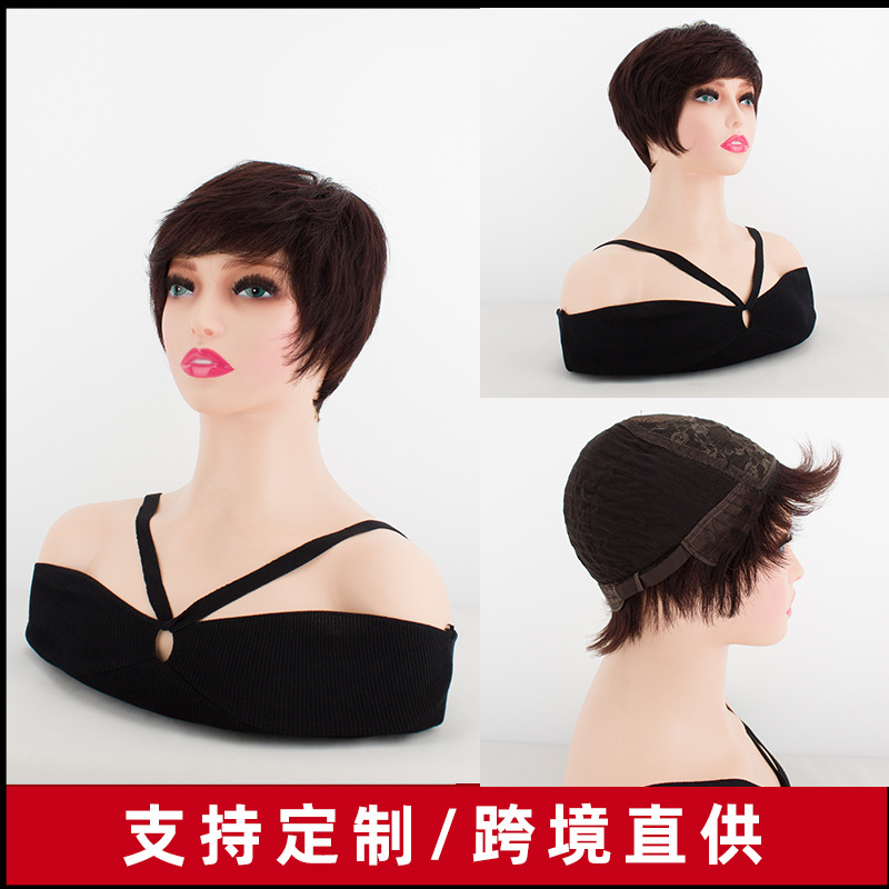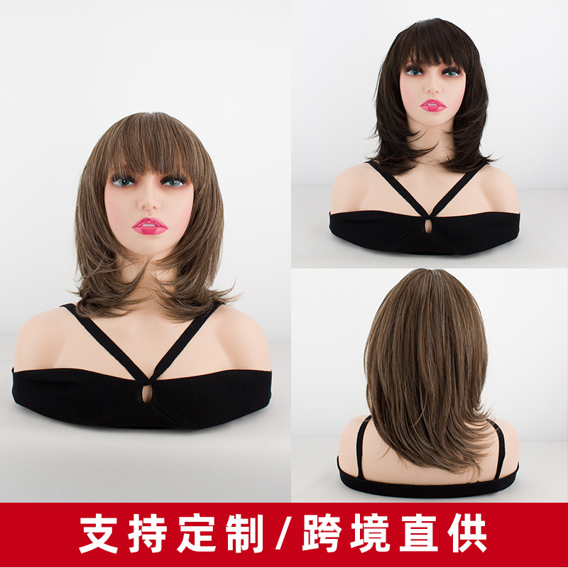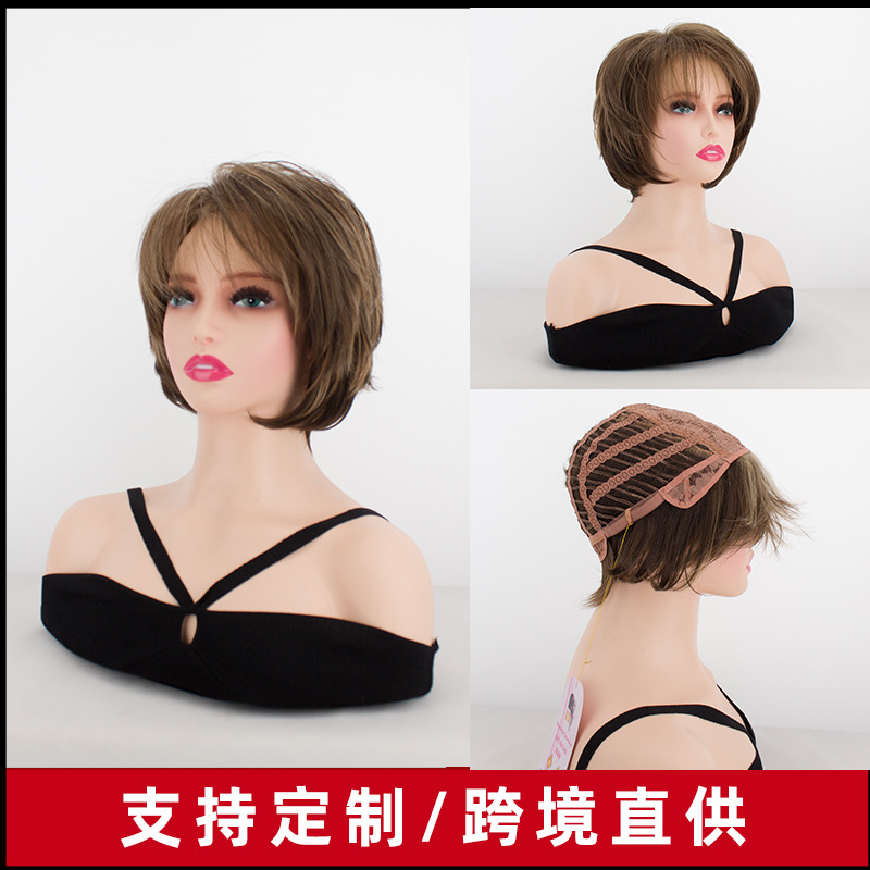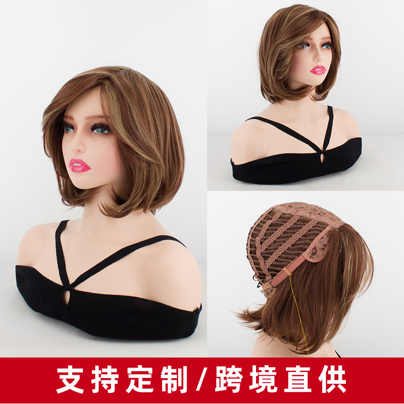 外国貿易のファッションのかつらの女性の短いストレートの髪の中でボタンのふわふわしている波の頭の中で茶色のシミュレーションの髪のかつらのセットの卸売りを分けます。