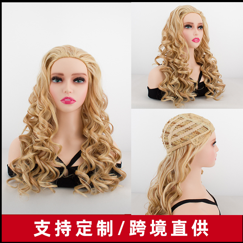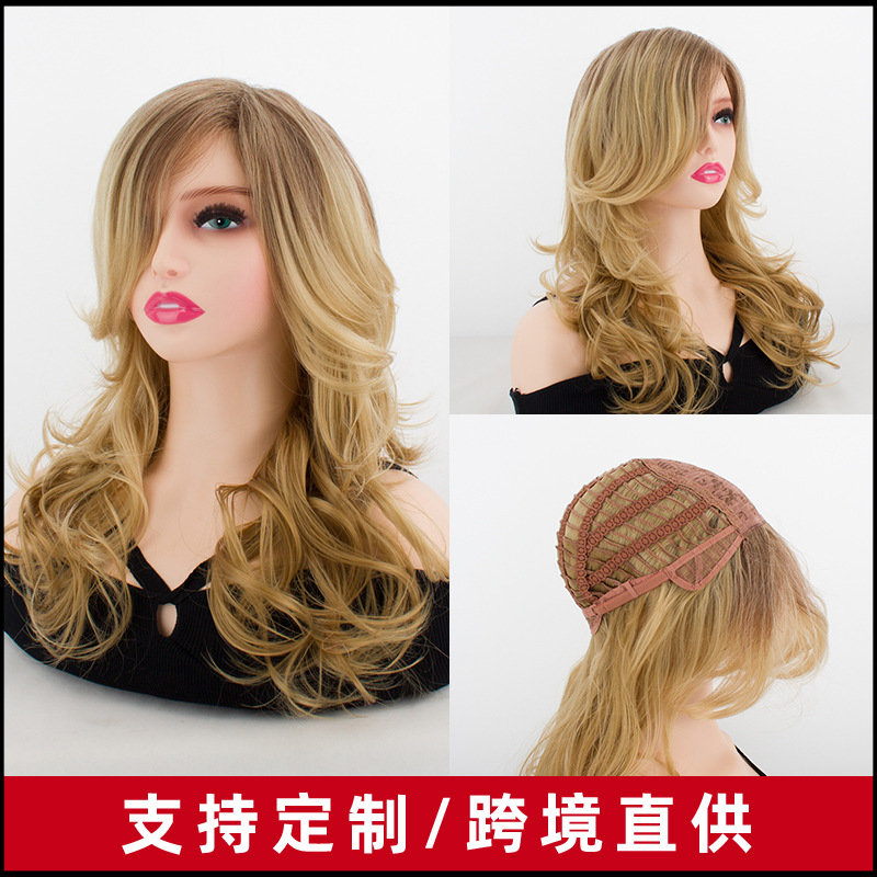 ファッション的な偏った前髪のない精緻な質感の大きい波の中で長い巻き髪の欧米の外国貿易の女性のかつらの全頭カバーの卸売り