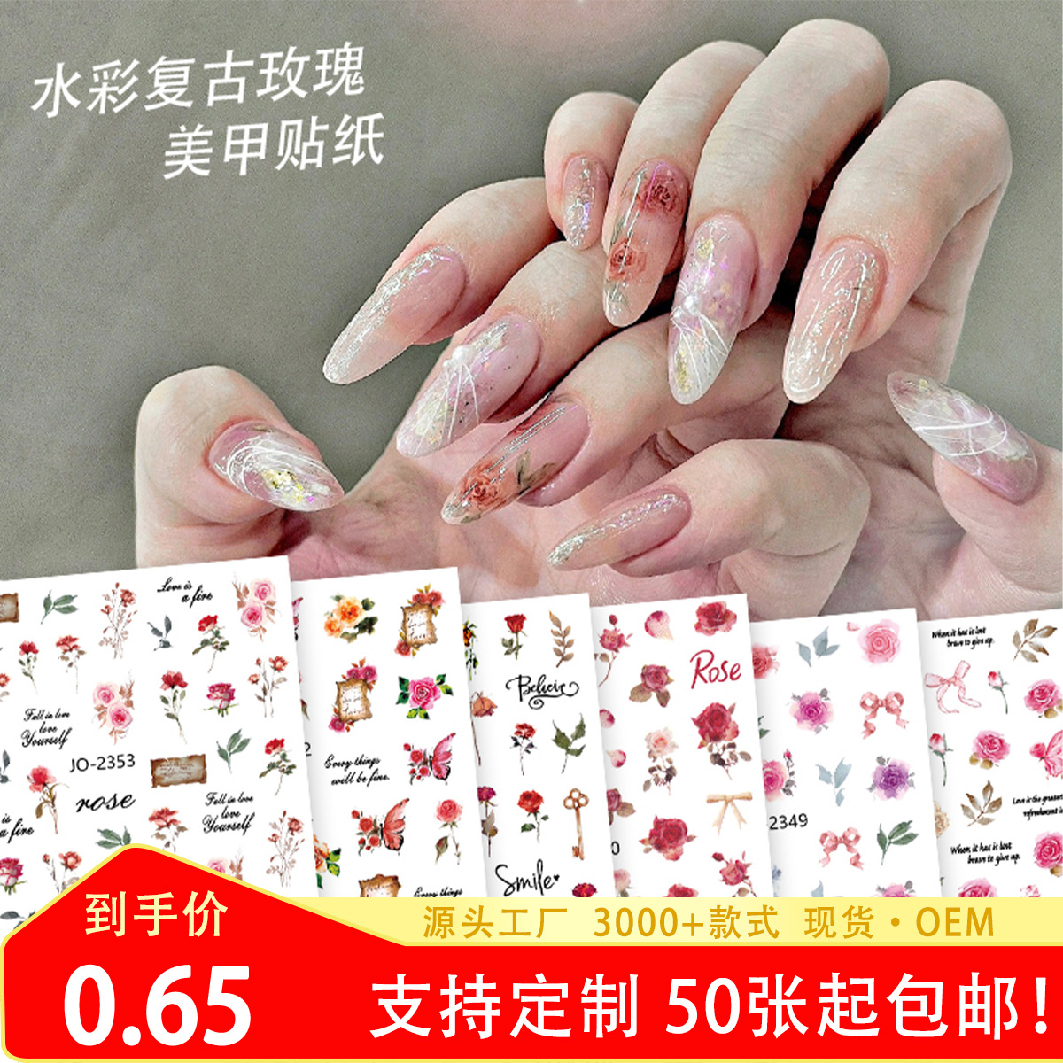 スポットインスタイル超薄型レトロ水彩バラの花文字パターンネイルアートステッカーネイルデコレーションアクセサリー