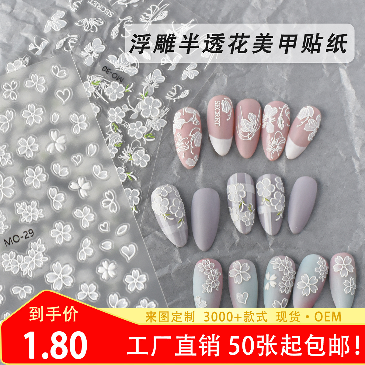 Mosr新品レリーフ花ネイルシールホワイト半透5d立体桜五弁花小さな柄爪ステッカー