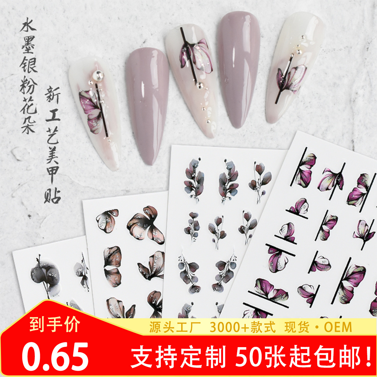 ネット赤銀粉水墨花ネイルシールが日本式ネイルアートの対外貿易風セットネイルアートバックルネイルシールにぼやけている