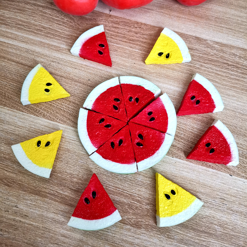 プラスチックの小さいスイカの切れの果物の塊の模型をシミュレーションします。