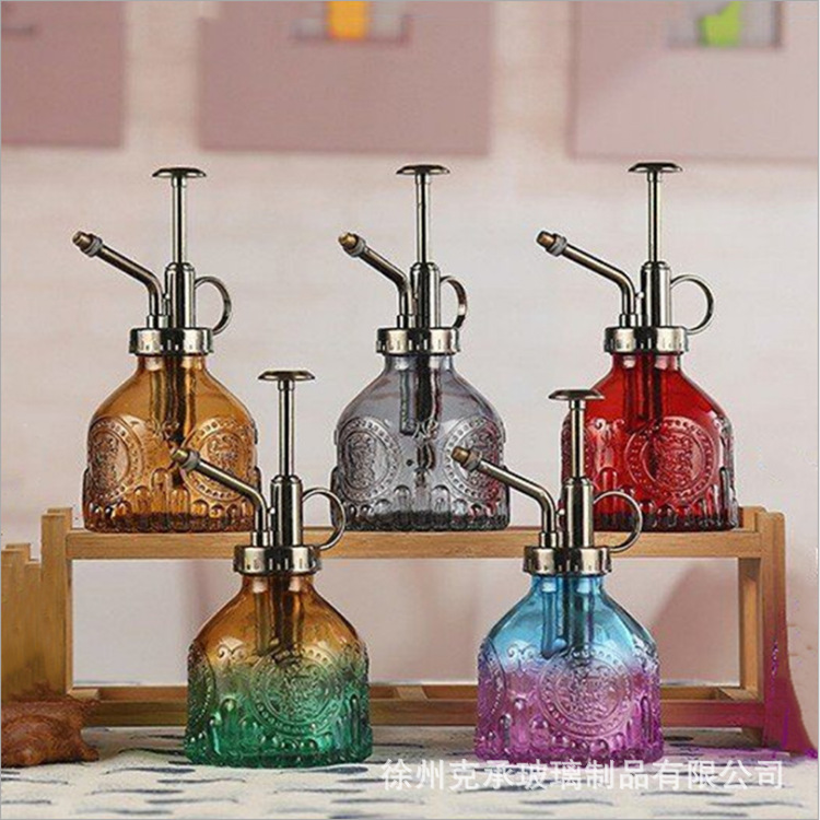 レトロなレリーフのスプレーポットのカラーグラデーションのヨーロッパ式のガラスの水筒の園芸は花の水筒をかけます。