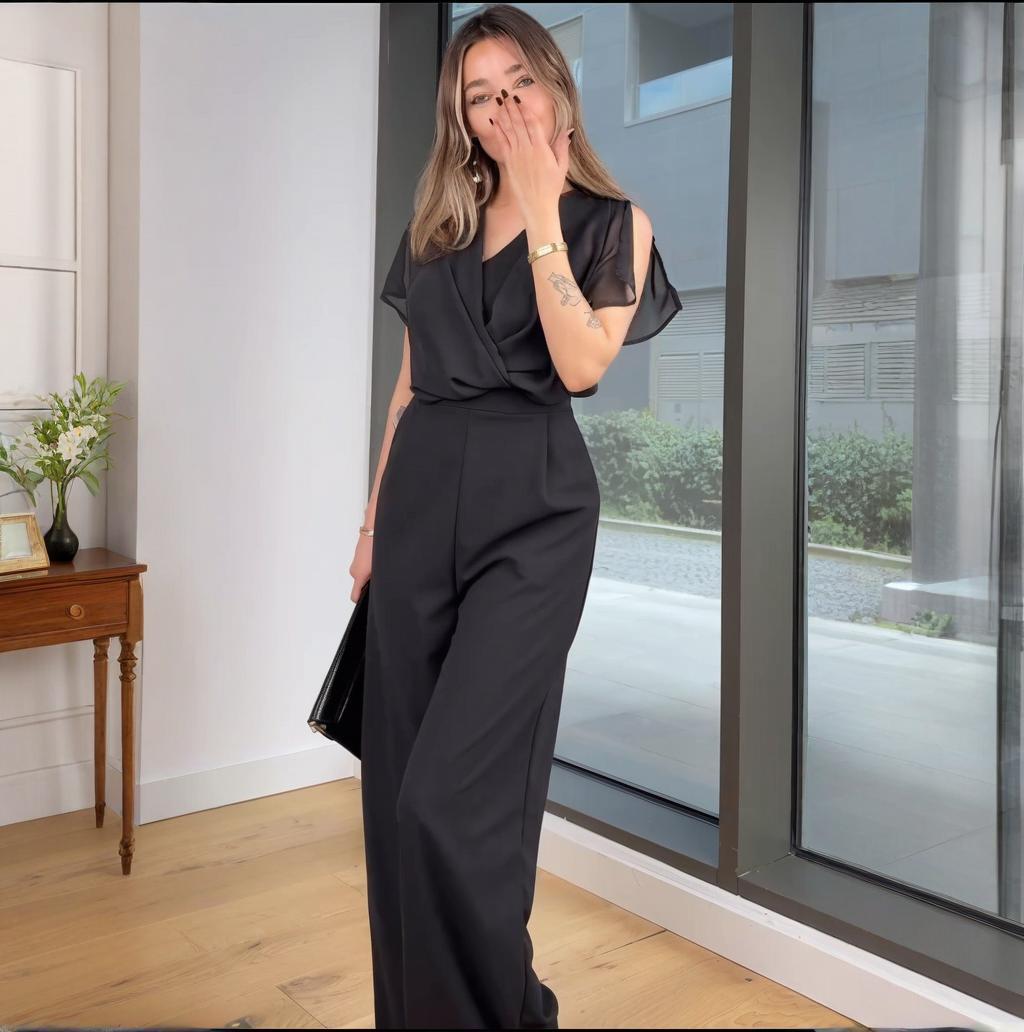2025春夏新作ハイウエストワンピース黒三分袖スリム着痩せ気品ワイドレギンススーツ女性