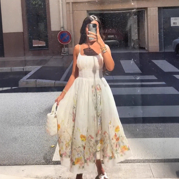 2025 夏のアマゾンの新しいヨーロッパとアメリカのクロスボーダー婦人服気質プリントサスペンダーフレッシュでファッショナブルなウエストドレス