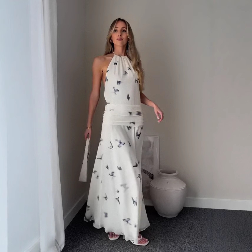 2025 夏のアマゾンの新しいヨーロッパとアメリカのクロスボーダー女性のプリントレースアップ通勤バックレス気質ウエストドレス