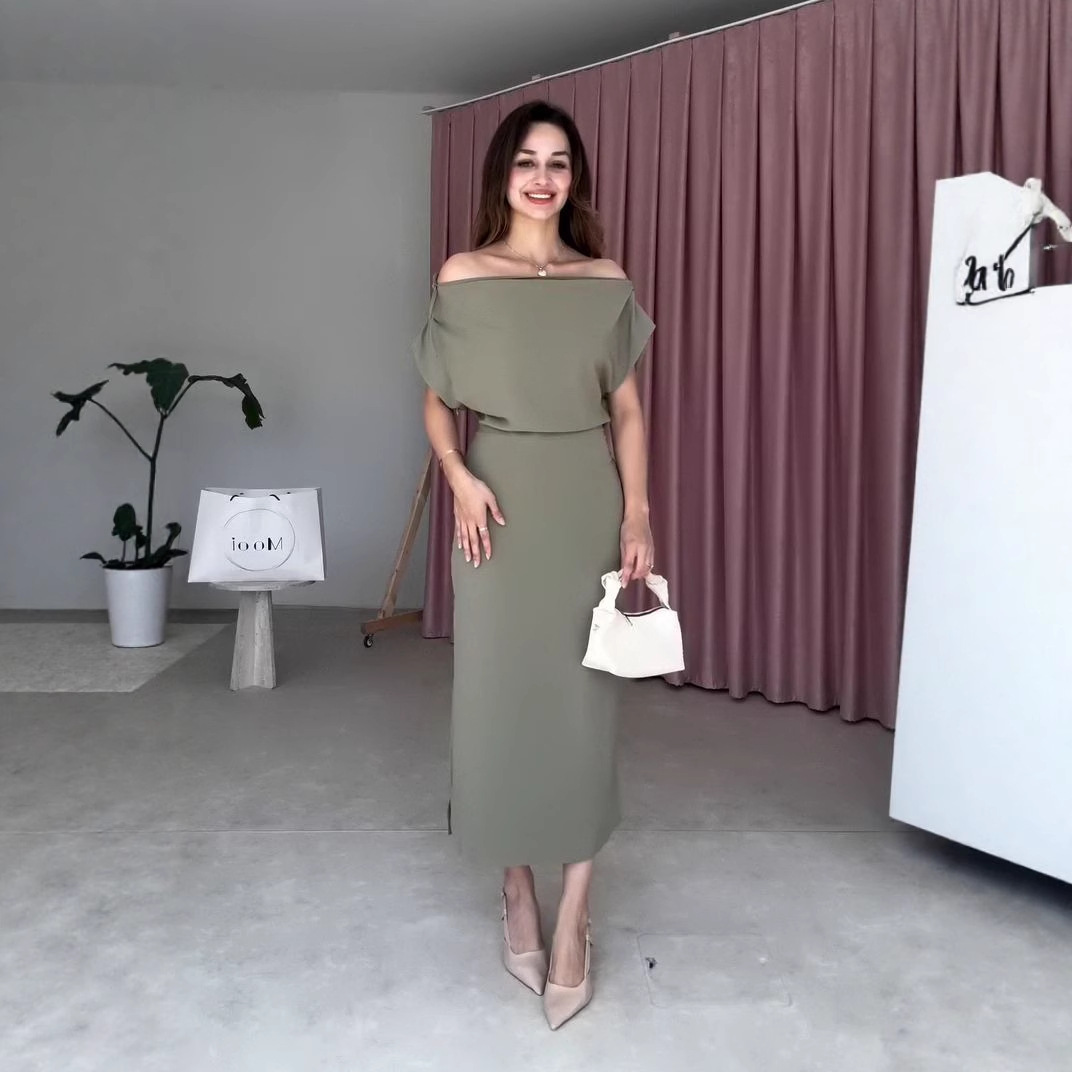 2025 夏のアマゾンの新しいヨーロッパとアメリカのクロスボーダー婦人服ワンライン襟気質ウエストカバーヒップスカート無地ドレス