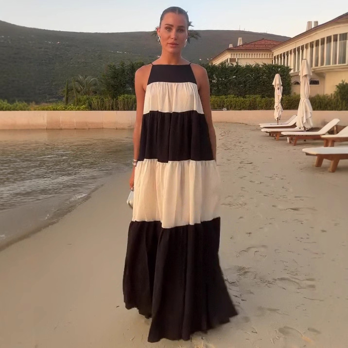 2025 夏のアマゾンの新しいヨーロッパとアメリカのクロスボーダー婦人服コントラストカラーノースリーブ気質通勤ウエストロングスカートドレス