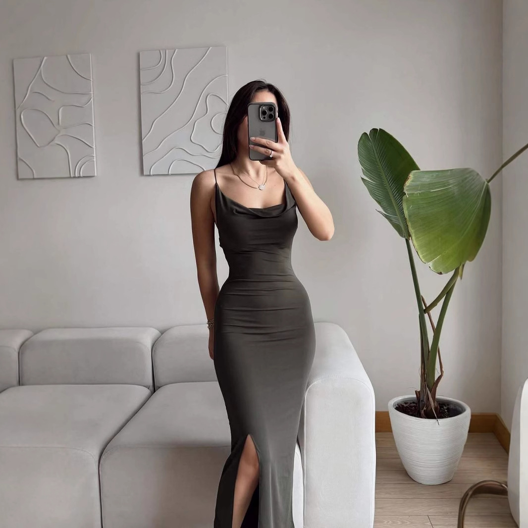 2025 夏のアマゾンの新しいヨーロッパとアメリカのクロスボーダー婦人服の気質セクシーなスリット無地サスペンダーウエストドレス
