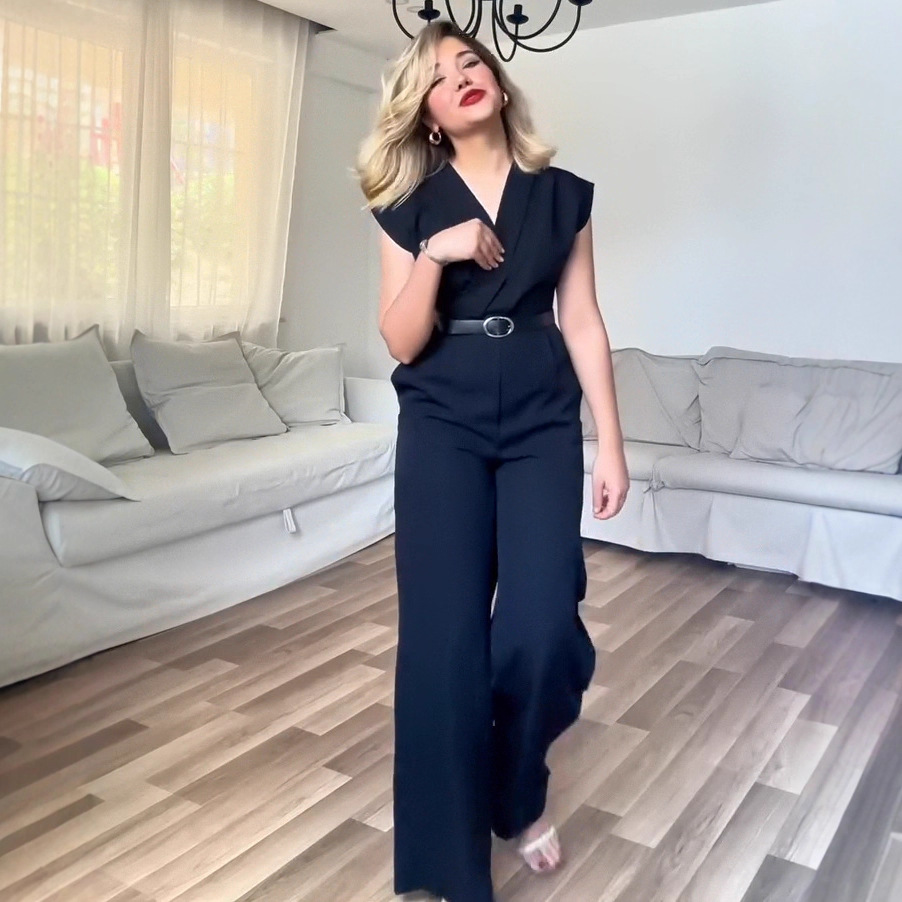 2025 夏の新スタイルクロスボーダーヨーロッパとアメリカの貿易女性ベルト無地ワイドレッグパンツ気質通勤ファッションジャンプスーツ