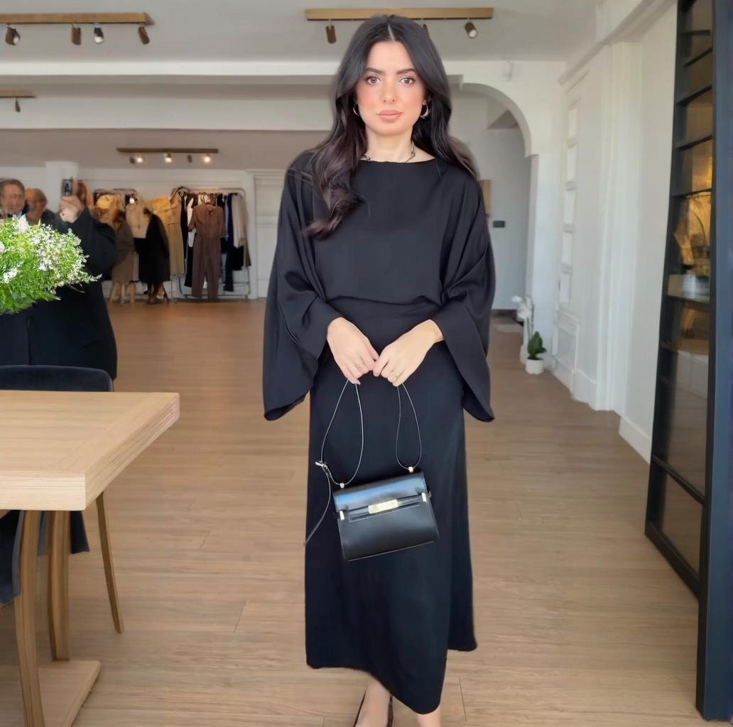アマゾン欧米のクロスボーダー2025年の新型純色のサテンのコウモリのショールの気質は腰の長袖のワンピースを収めます。