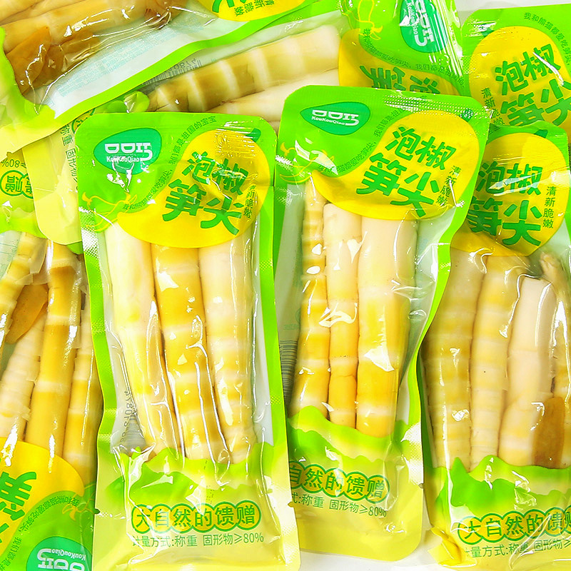 口当たりの良いピーマンのタケノコの先の新鮮なタケノコの酸っぱいタケノコの小さい包装のタケノコは袋を開けてインスタントスナックを食べます。