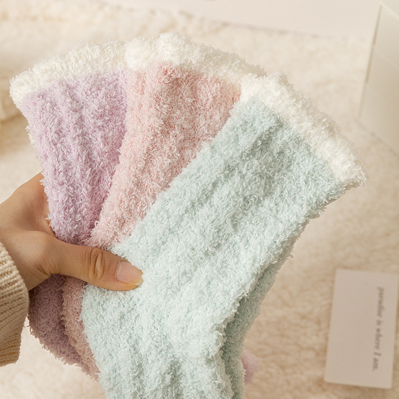 珊瑚绒袜子女中筒秋冬加绒加厚家居日系纯色保暖可爱卡通睡眠袜子