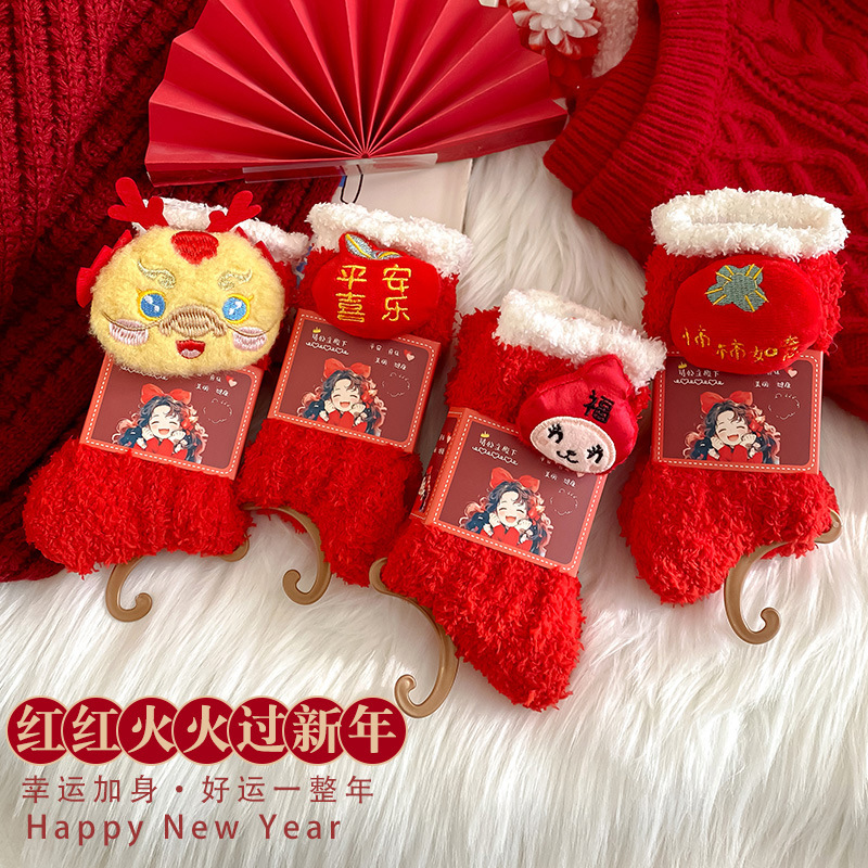 本命年の靴下の女性秋冬の珊瑚の毛の中筒は厚くてかわいい毛の毛の毛の毛の大きい赤い床の睡眠の靴下を厚くします。