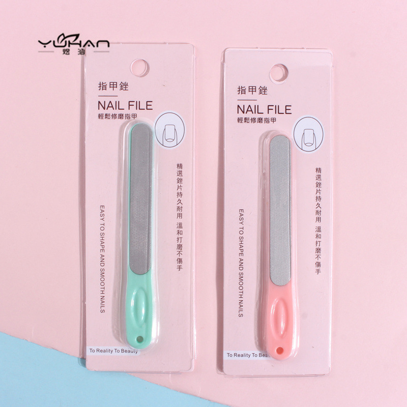 爪やすりのプラスチックの柄で爪を磨きます。