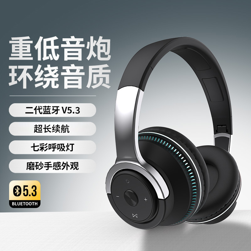 海外で人気のヘッドホン型Bluetoothイヤホン、重低音ステレオ、カラフルなライト、カード挿入可能、コンピューター用ワイヤレスイヤホン、卸売
