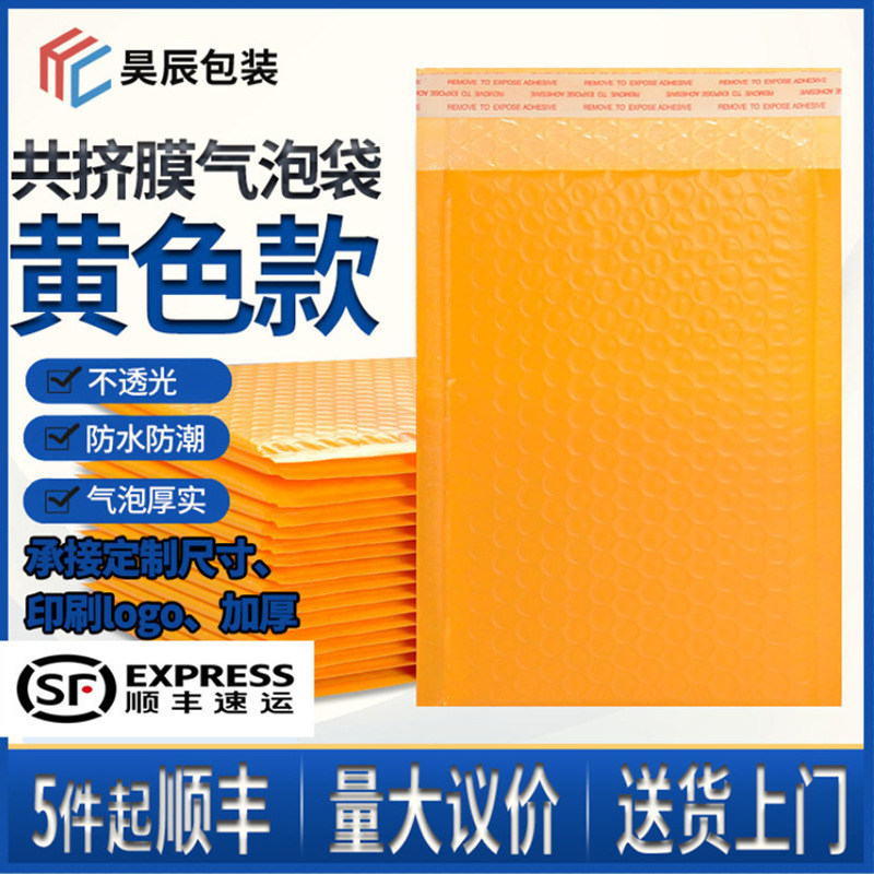黄色の共押出フィルムバブルバッグ、圧力軽減と不透明性を備えた卸売小物包装、衝撃吸収性と耐圧性を備えた電子商取引用エクスプレスバッグ