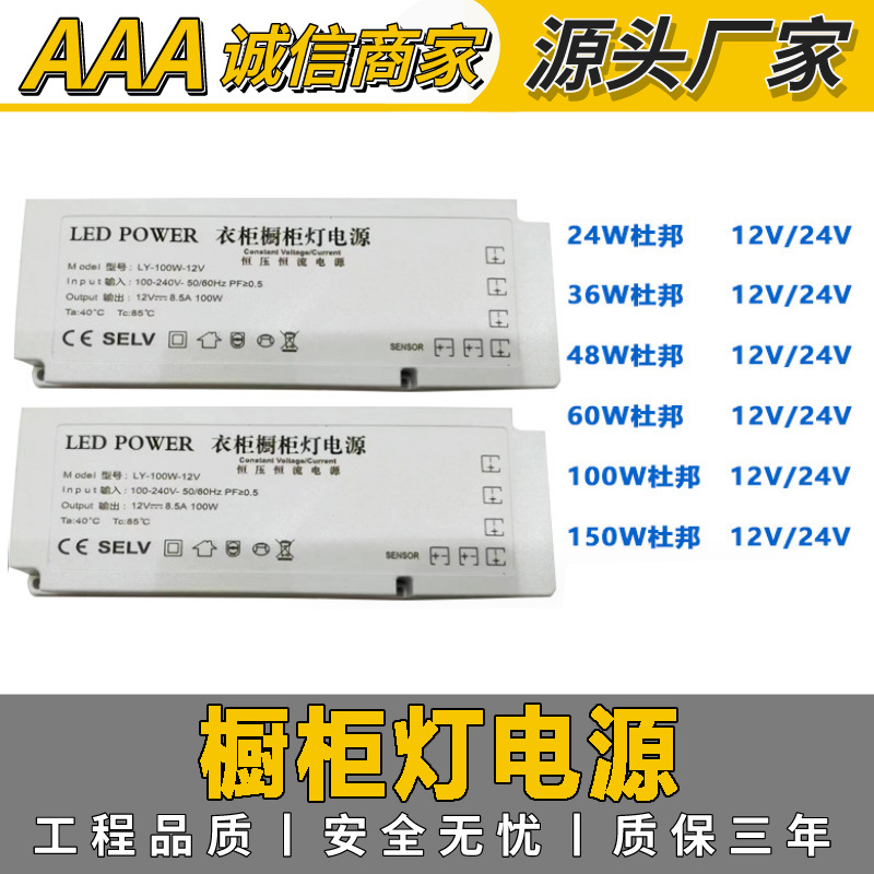 Ledキャビネットライト電源12v/24v品質保証3年60w 100w 150wキャビネットを供給する. ワードローブデュポン電源