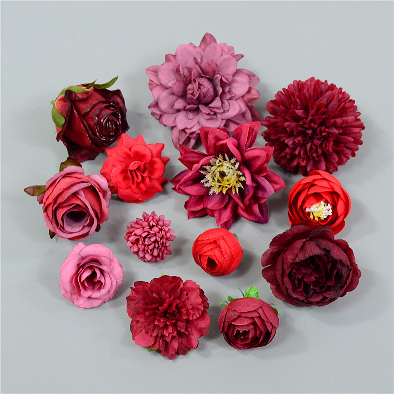 ワインレッドの模造花絹花かんざし花戯曲団扇装飾結婚祝い花壁テーブル花部品痛み包生け花素材