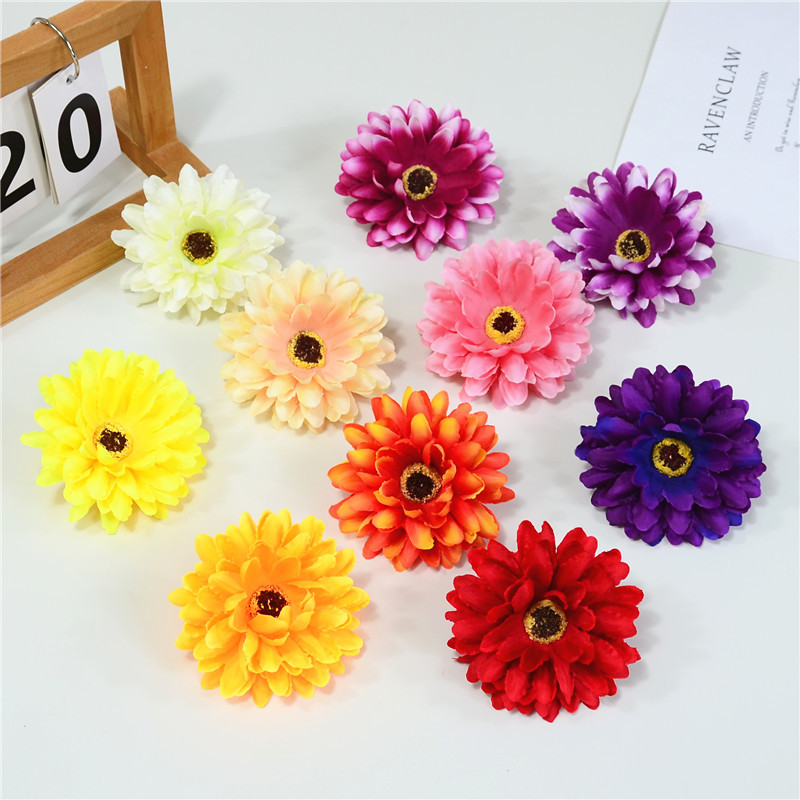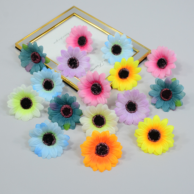 小さいヒマワリの花の頭の卸売りの7cmの太陽の花の結婚祝いの手首の花の部品の森の女性の花の輪の製作をシミュレーションします。