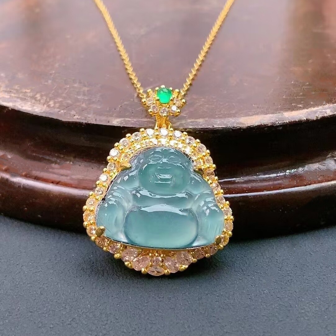 鄒六禧天然藍水翡翠a品仏ペンダントS925銀は新中国式大腹弥勒仏鎖骨ネックレスをはめ込んでいます。