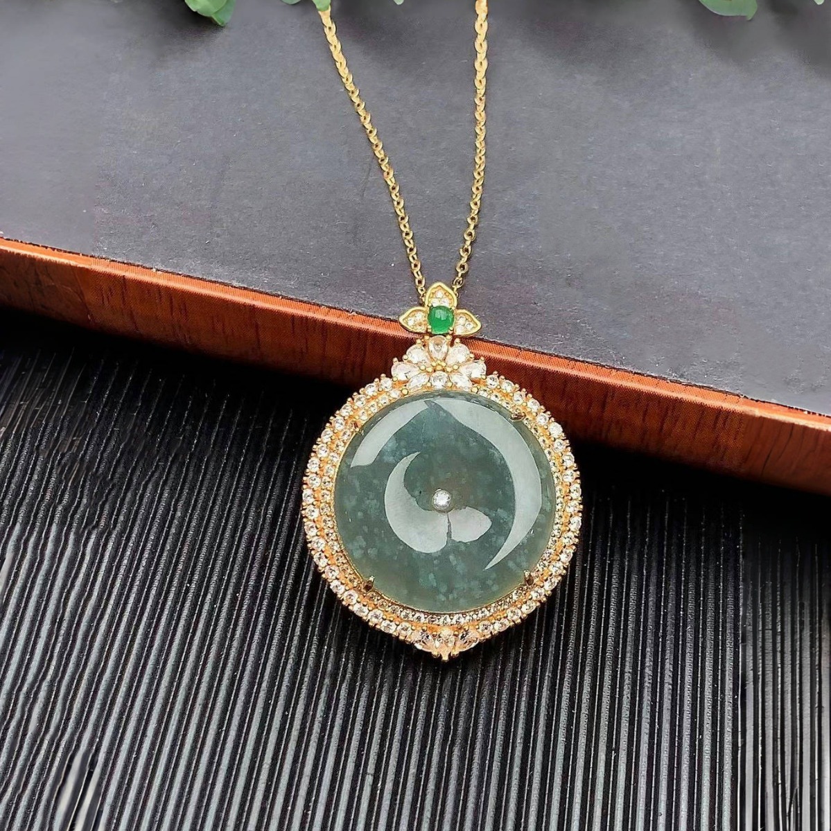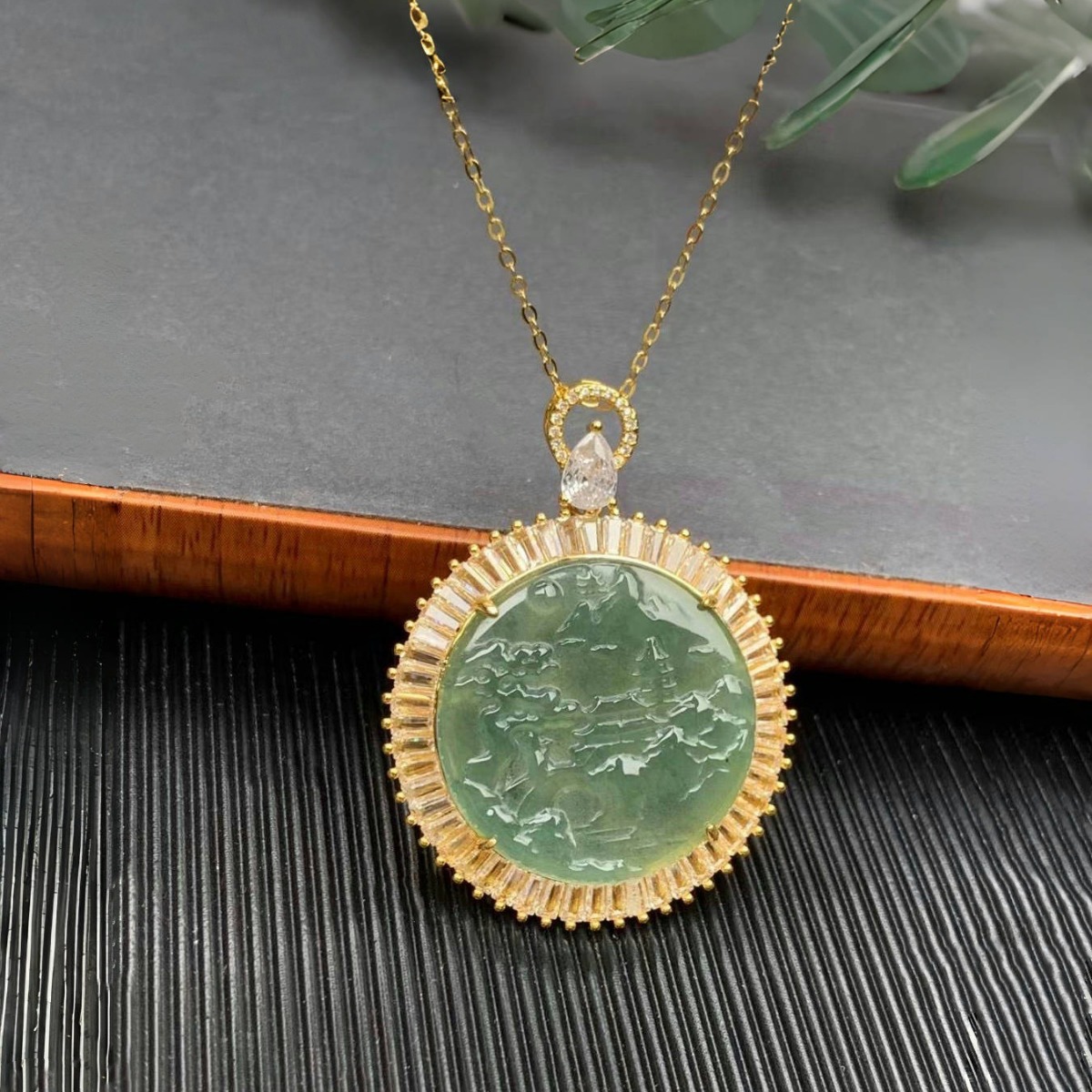メーカー直供天然a品翡翠危険材料円牌山水風景牌銅象眼ペンダントネックレス玉ペンダント