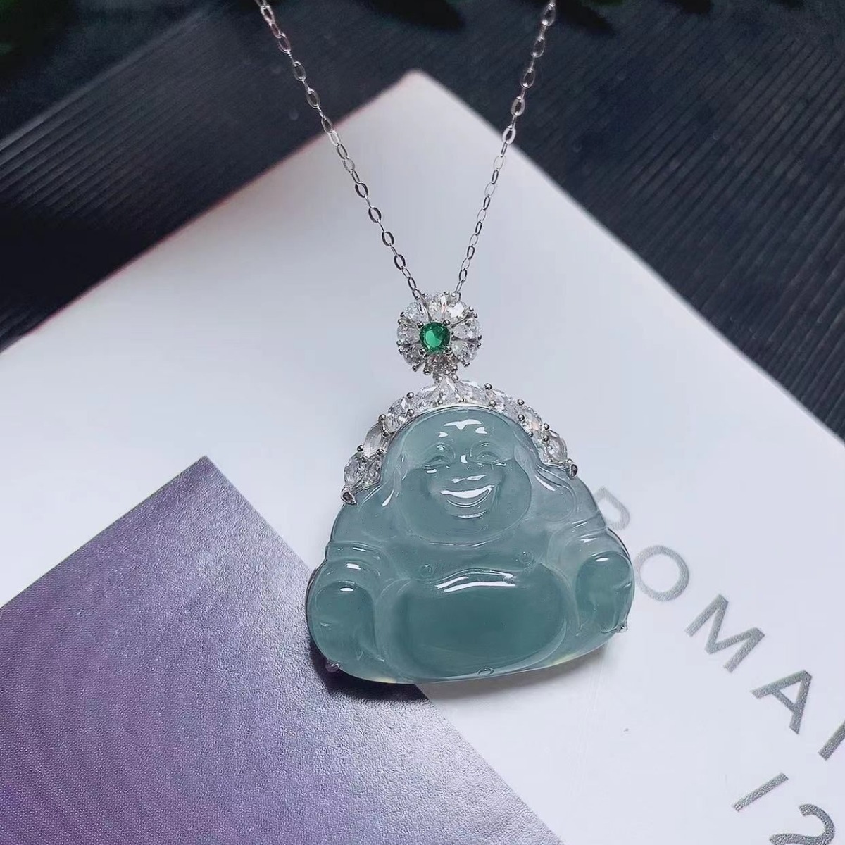 生中継ソース天然危険料翡翠藍水弥勒仏公S925銀モザイク笑仏玉ペンダント