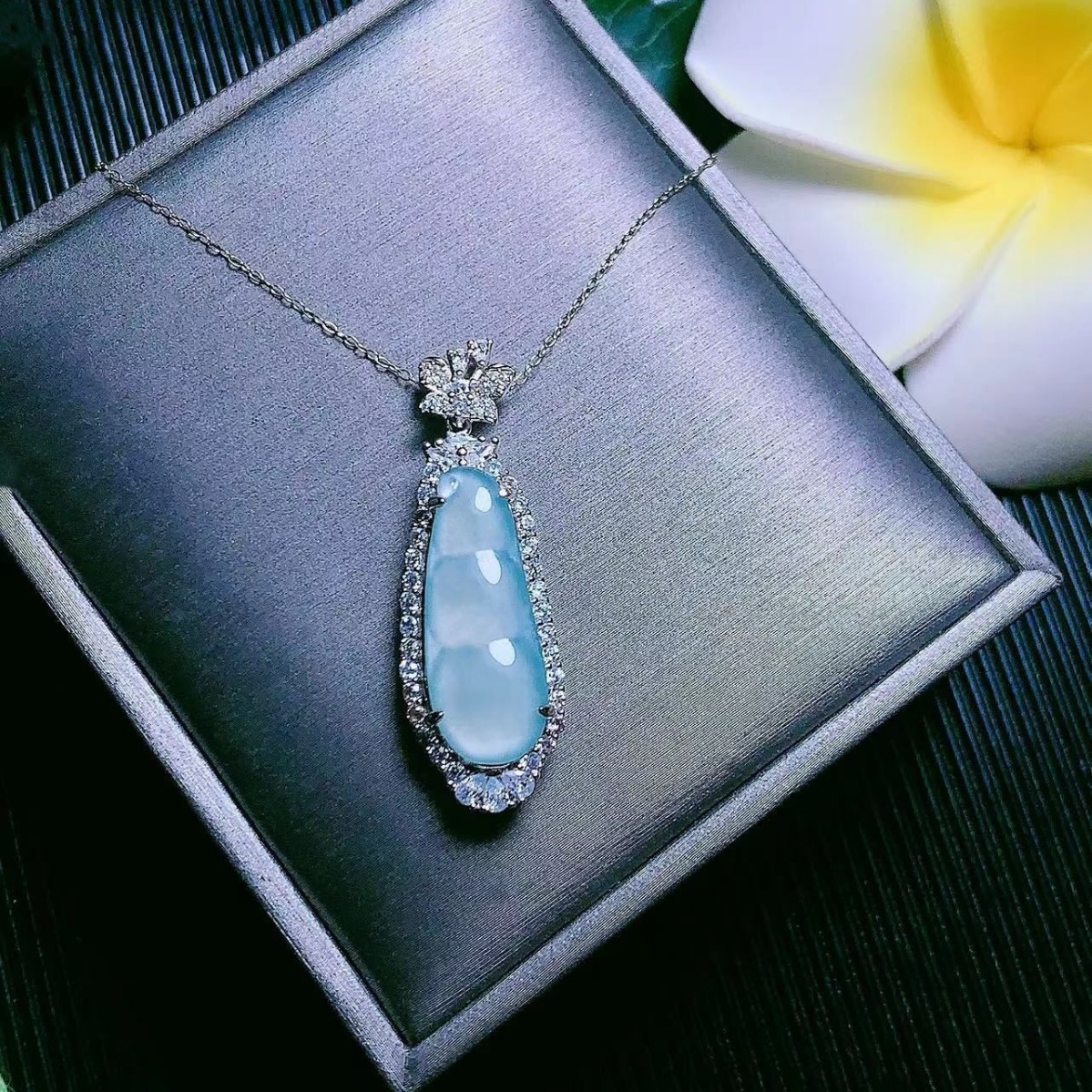 天然の危険材料の青い水の翡翠の危険材料の蝶のペンダントの銅は玉の甘い鎖の鎖を象眼してぶら下げて生放送の卸売りをします。