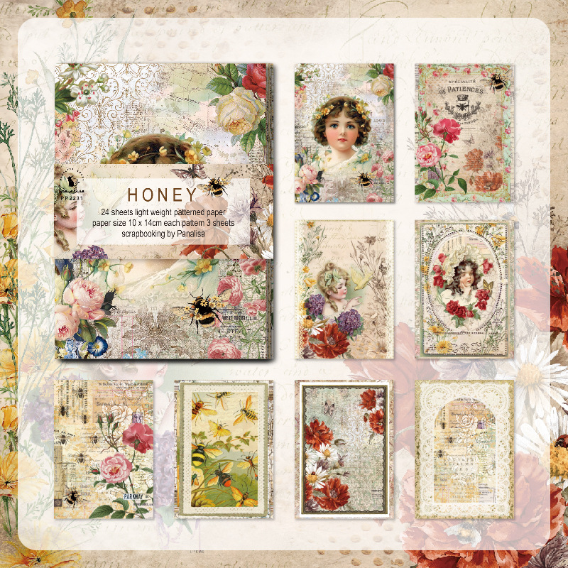 24枚diyアルバムステッカー手帳素材紙レトロミツバチ背景紙パターン紙pp22031