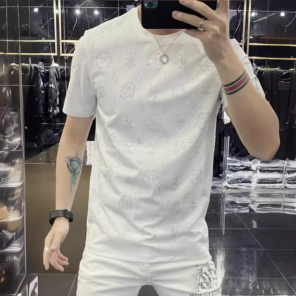 夏の新作 Tシャツ メンズ ヨーロッパとアメリカのトレンディなカジュアルホットダイヤモンドパーソナライズされたラウンドネックスリムフィットシルケットコットン通気性半袖