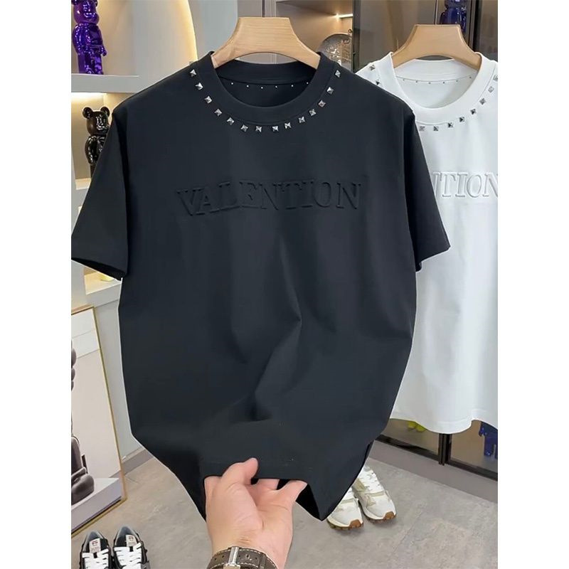 新しいトレンディなリベットスチールプリントルーズラウンドネック半袖Tシャツメンズ夏のファッション多用途カジュアル高品質トレンディな服