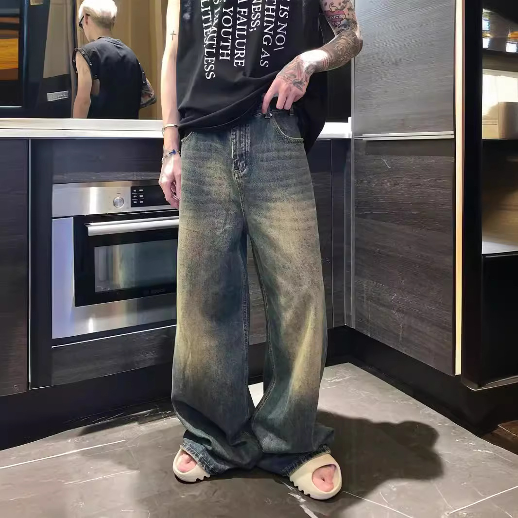 秋冬ジーンズメンズルーズワイドレッグアメリカンレトログラデーショントレンディブランドハイストリートハンサムロングパンツ