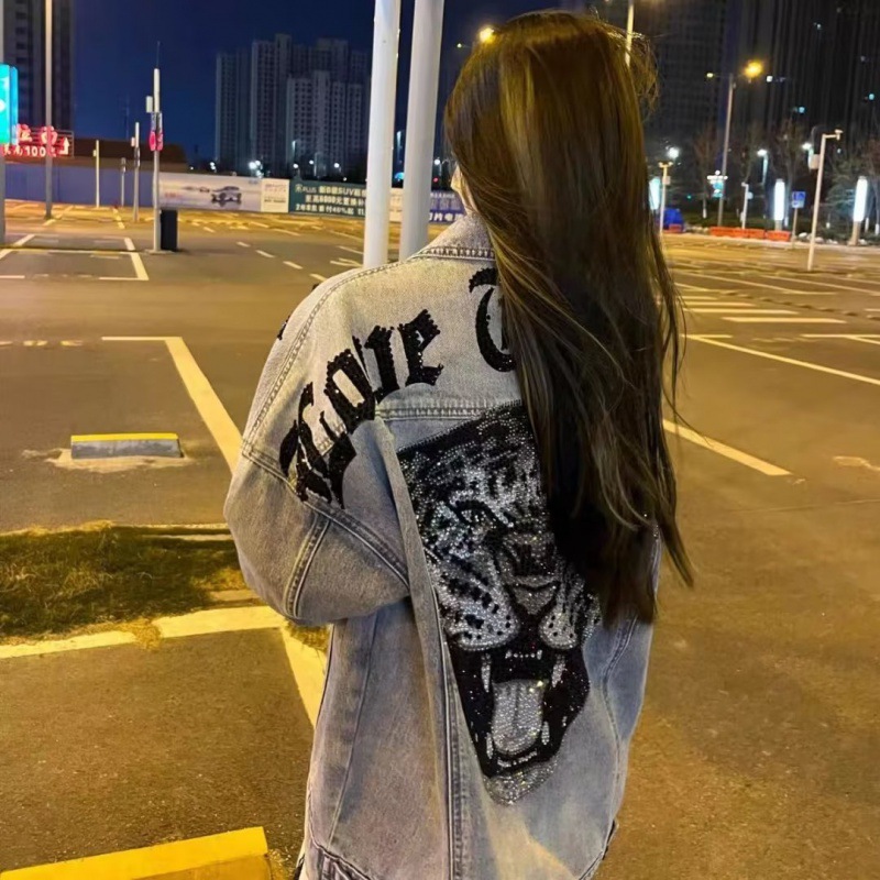 ファッショナブルなライトラグジュアリートレンディブランドホットダイヤモンドバックヒョウヘッドジャケットデニムジャケット男性と女性のルーズトップ2024秋の新作