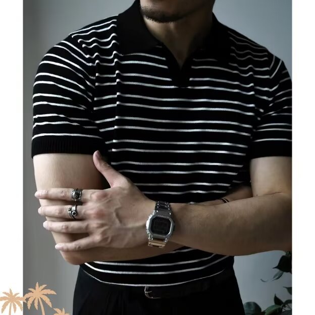 夏のメンズ半袖ストライプpoloシャツ中年のゆるいタイプの薄いタイプのビジネスカジュアルなファッション都市半袖