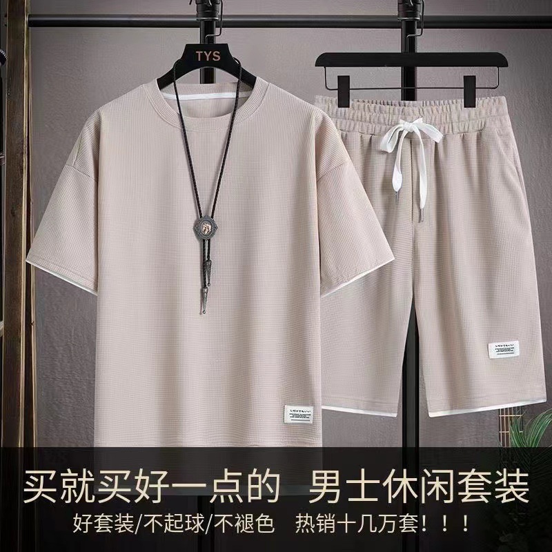ワッフルカジュアルスーツ男性夏青少年ビッグサイズ男性用スポーツ半袖ショートパンツとtシャツセット
