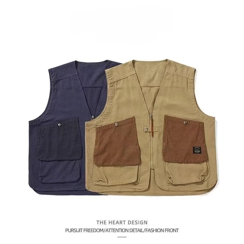 日本の大きなポケット作業服ベストメンズ夏レトロルーズカジュアルジャケット香港スタイルノースリーブベスト V ネックベスト