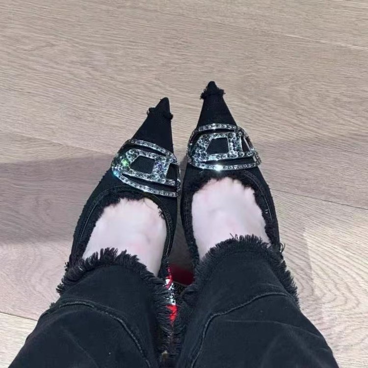 2025新型のレトロなデニムの色の先の後の空のハイヒールの金属の装飾の先の気質のファッションの女性の靴