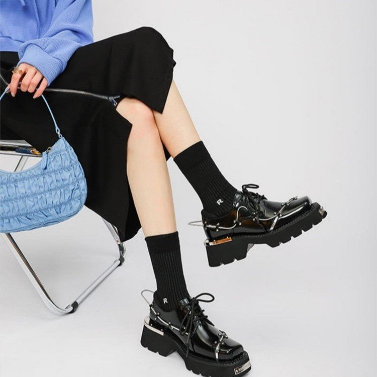 ファッションのクールなスプリングの装飾の厚い底の靴の女性の本革の英倫の風の方の頭の徳比の靴の黒系の太さと小さい靴の女性