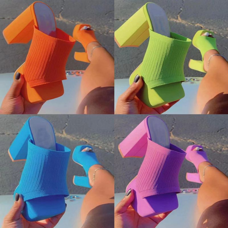 クロスボーダーの夏の方の頭の太いハイヒールのメリヤスの弾力のスリッパの女性のファッションの対外貿易の大きいサイズの1足は足を緩めて飛んで涼しく引き延ばします。