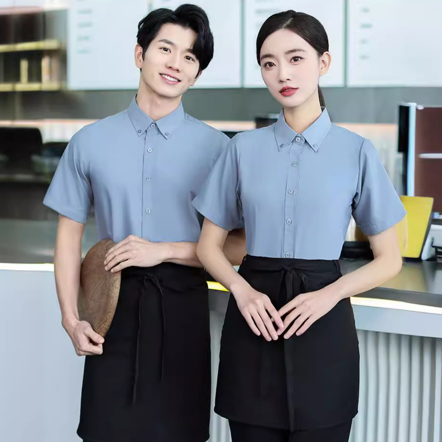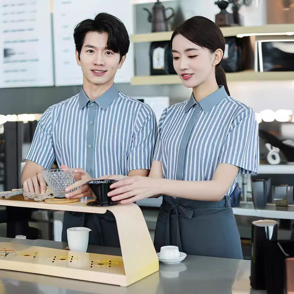 夏のホテル飲食作業服半袖ストライプシャツカフェミルクティー店ファッション男女レストラン制服