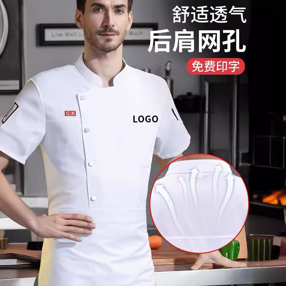 純白シェフ作業服男性半袖夏通気レストラン食堂シェフ服ロゴ焙煎工衣