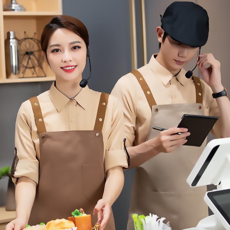 レストランのエプロンホテルの朝食カフェのグルメ城の入り口のミルクティー店の鍋の従業員の男女の仕事のエプロン
