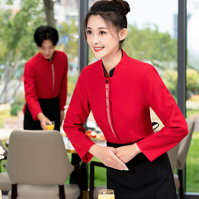 中国式従業員の作業服長袖レストランレストランレストランの前ホールの赤い工装秋冬セット