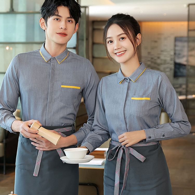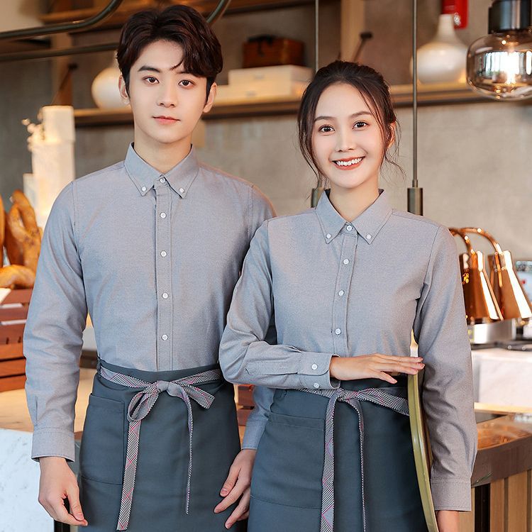 レストランのステーキ店の従業員の作業服の灰色の白いシャツの秋の長袖のホテルの飲食の鍋のミルクティーの店