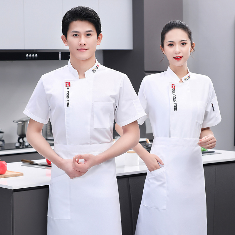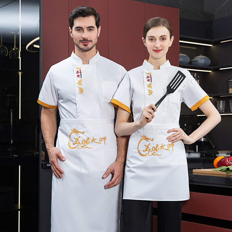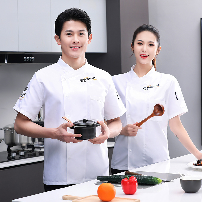 新しい白いシェフ服半袖シェフ作業服男女夏飲食ホテルキッチン工装刺繍ロゴ