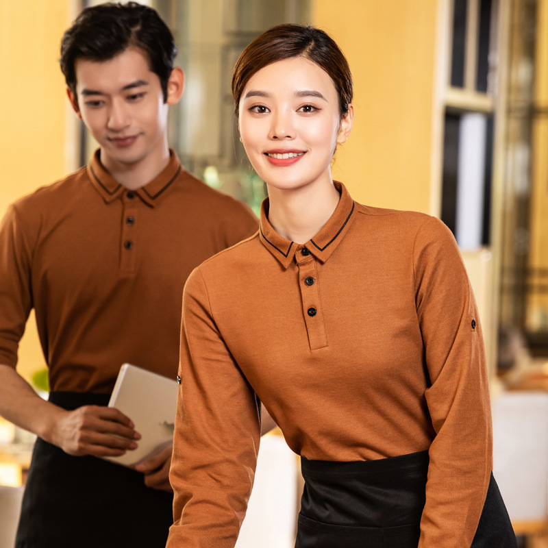 ホテルの従業員の作業服の長袖秋冬服の飲食レストランの鍋のミルクティーのホテルの従業員の服のtシャツは刺繍を印刷します。