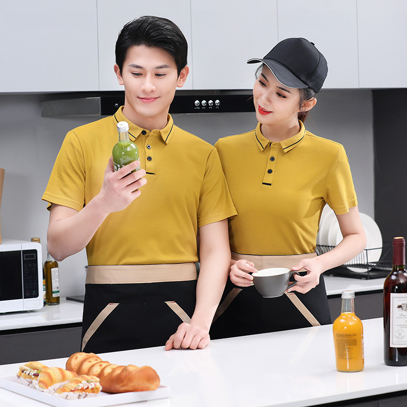 新しいレストランの半袖の通気性の作業服の男女の飲食のミルクティーの鍋のホテルのバーベキューの従業員はlogoを刺繍します。
