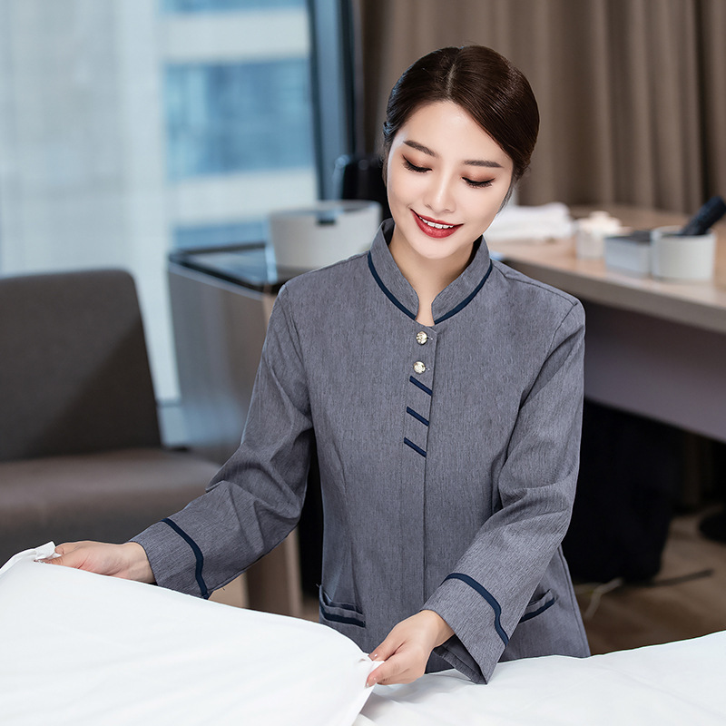 ホテルの客室の清潔な作業服の女性の長袖の秋冬服の団地のpaの従業員の家政婦のおばさんの清潔な服の印字